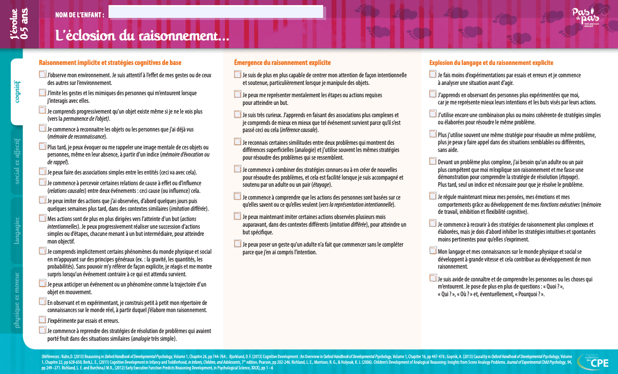 Fiche sur l'éclosion du raisonnement chez les 0-5 ans dans le cadre de Pas à pas, mon parcours éducatif.